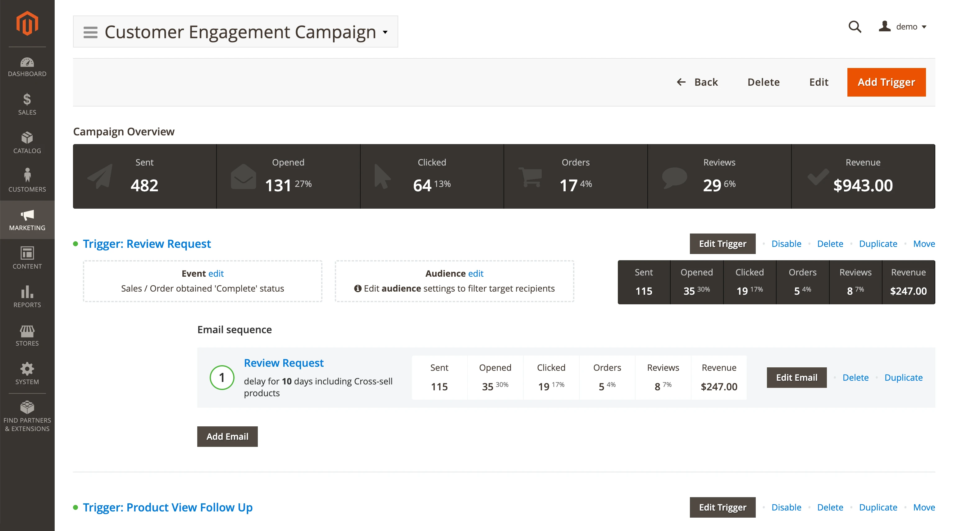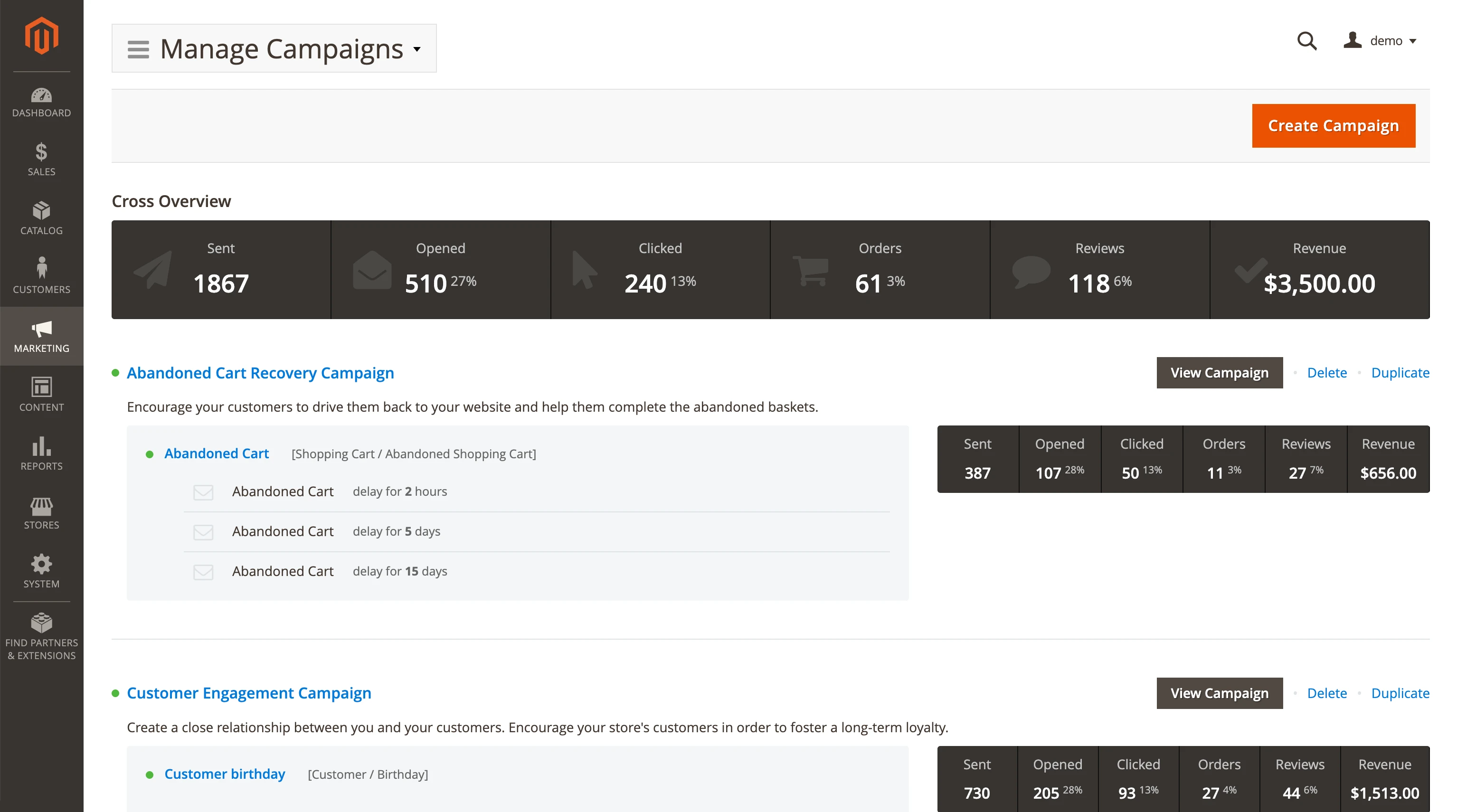 You will receive the following pre-configured campaigns after installing the Magento 2 Follow Up Email module: