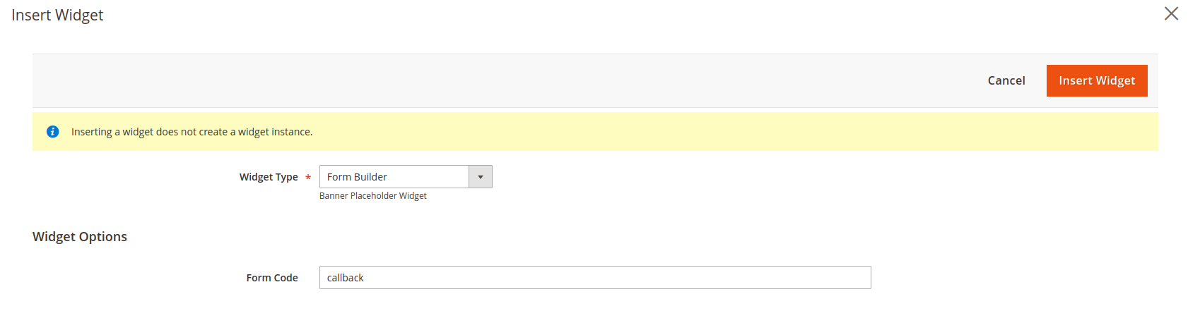 For example, you want to add Call Back form at the 404 Not Found page. Hence, on the Admin sidebar, go to Content -> Elements -> Pages select required CMS Page, or create a new one. At the Contend editor, add Insert Widget -> Widget Type choose Form Builder and enter the necessary Form Code.