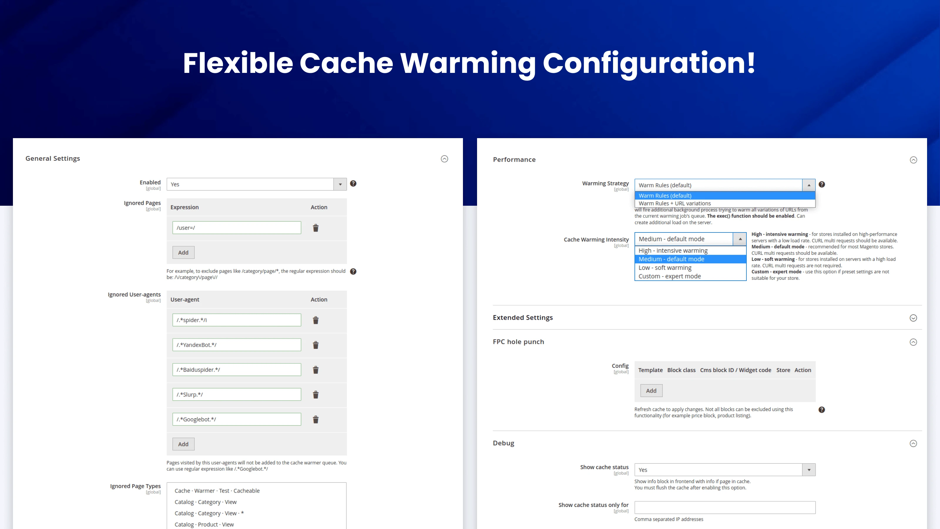 With Mirasvit extension Full Page Cache, you are not limited to predefined cache warming performance templates. The Module's performance settings are entirely adjustable. Using the custom performance setting, you may configure the following:
