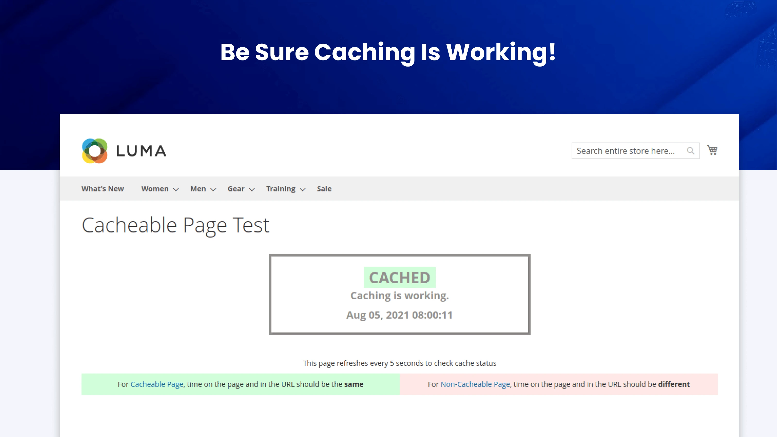 Verify for yourself that full page caching in your store works correctly using the test page that the Full Page Cache Warmer module provides. This page refreshes automatically, and displays the current status of the full page cache.