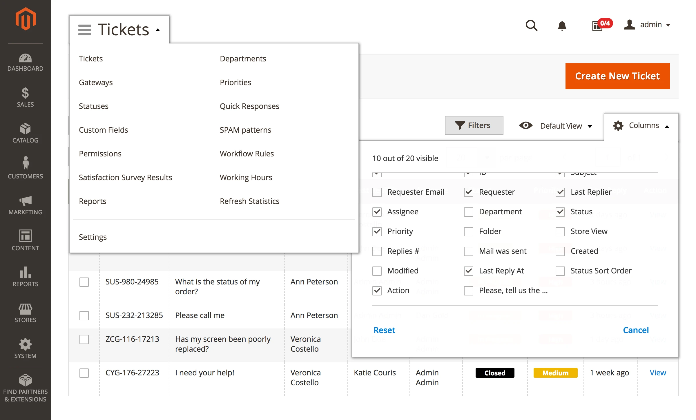 The following grid settings are available: Customer name, Department, Folder, Created, Action, ID, Last Replier, Status, Store View, Modified, Subject, User, Priority, Replies number, Last Reply at.