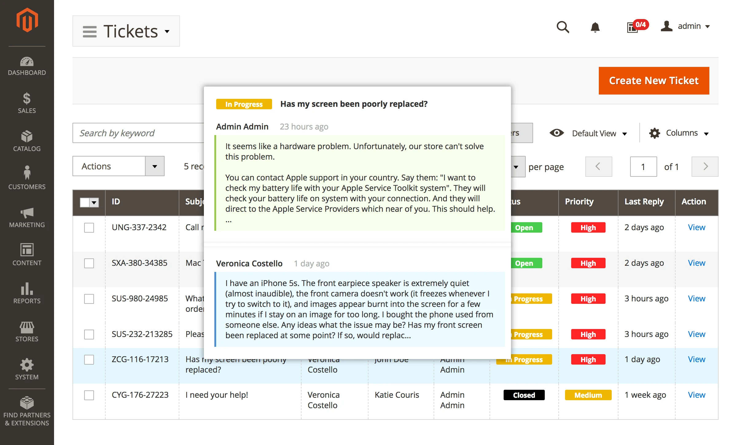Use internal filters for fast and easy organizing of all tickets. The extension allows you to filter tickets by any field (for example, by date created, status, priority, store view, user, etc.).
