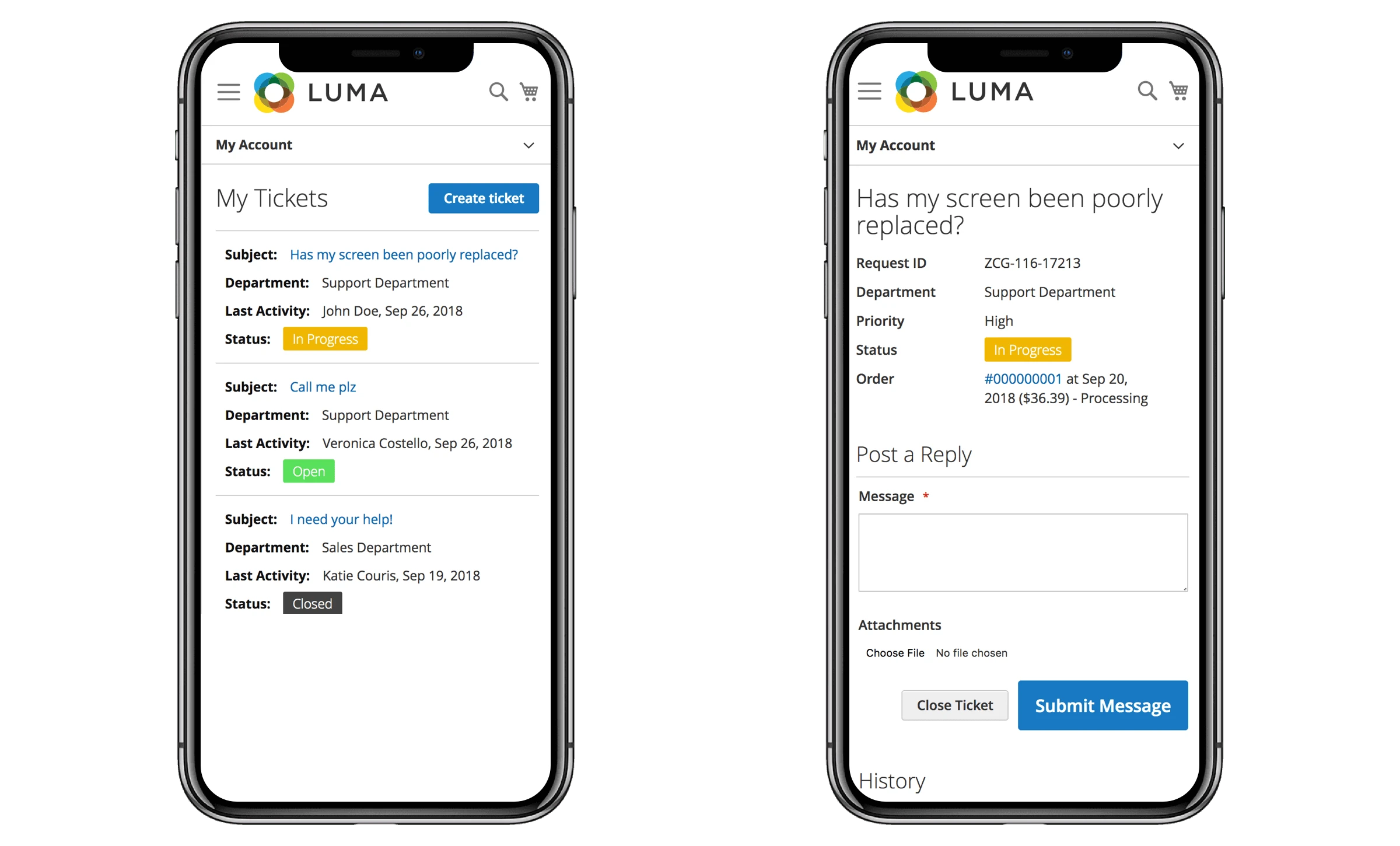 This way everything is tied to the customers' account. Orders, other tickets, returns, and previous communications. It also shows answered from the FAQ extension when submitting tickets.