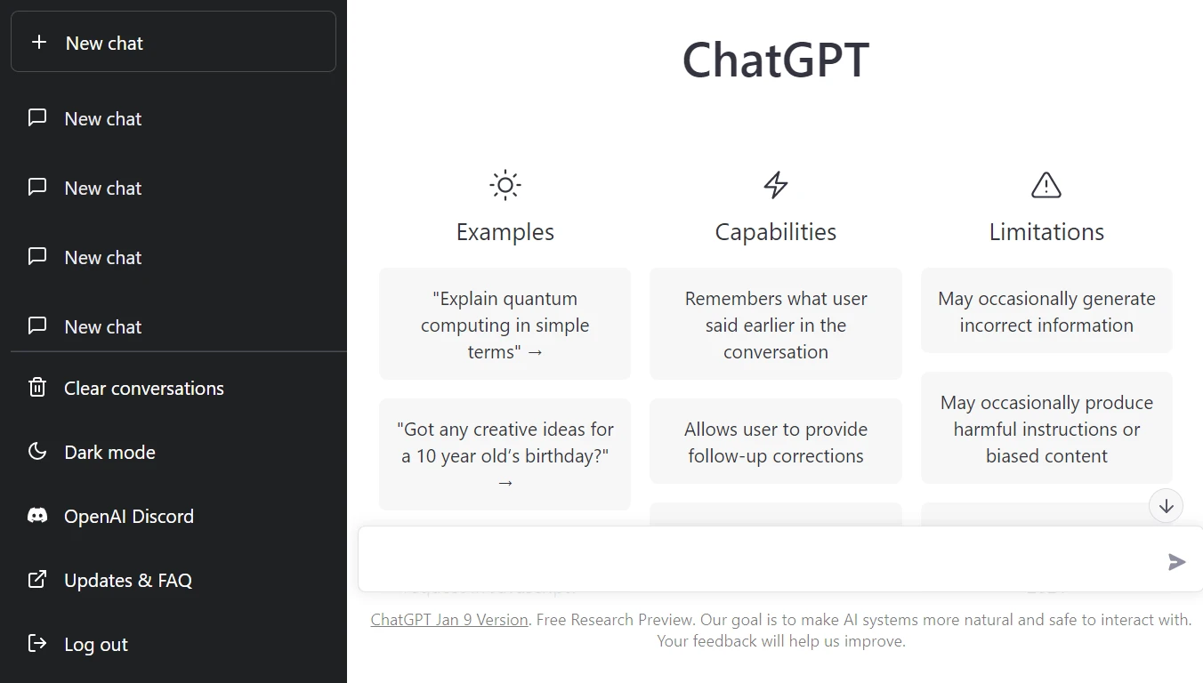 You will be provided with a chat window with a set of brief examples list of the chatbot's capabilities and limitations. At the bottom of the screen, you will see a text field to start a dialog with the chatbot.