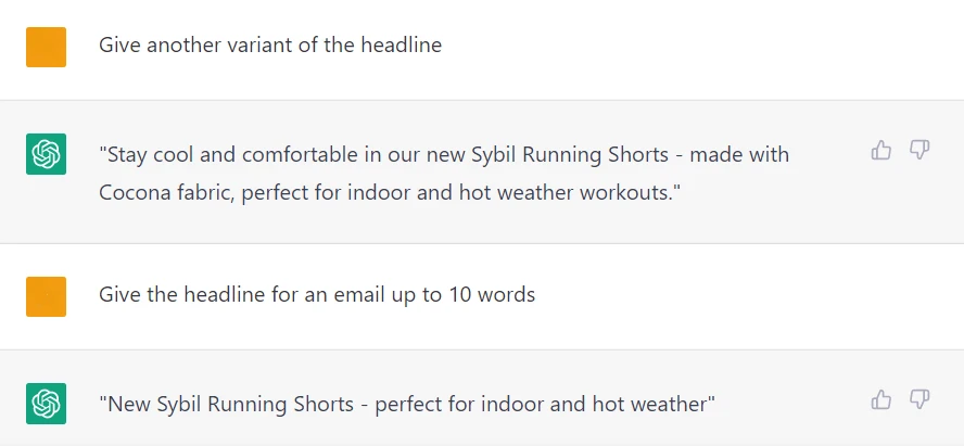 You may want to see some other variants for the subject line, so just ask for it in the next reply to ChatGPT. Refine the email subject line until you get a satisfactory result. For example the sweet spot for the headline is up to 9 words, so ask the chatbot to keep it shorter: