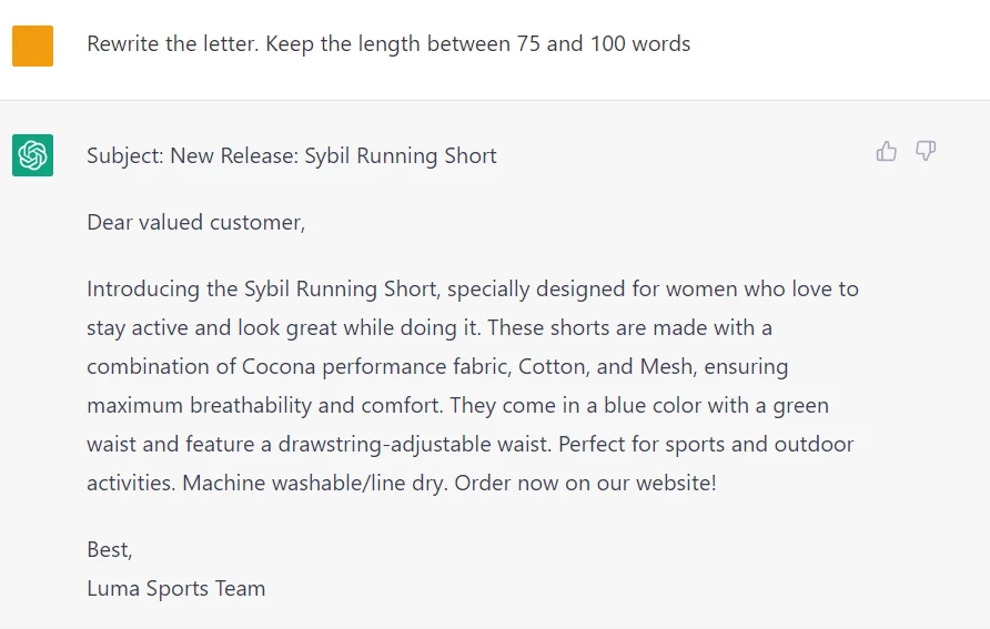 Now the output is 81 words, but that’s with the subject line. Let’s ask the ChatGPT to exclude the subject line from the limit: