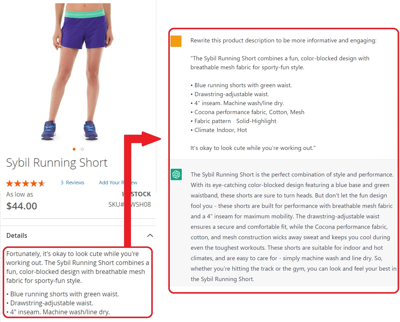 To enhance existing product description use it as a starting point for ChatGPT to work on and add some additional information. You can provide the product fashion style, product material, color or fabric pattern, climate conditions a product is intended for and other info on the product.