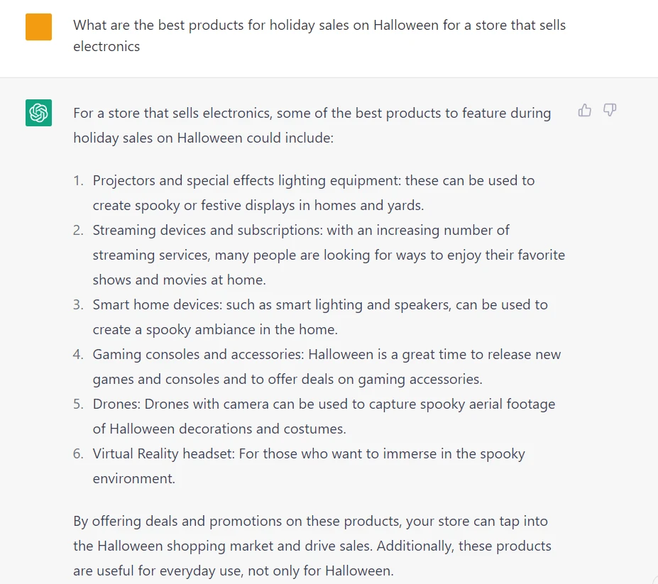 In the next replies you can add details and specify boundaries for the ChatGPT to give a more specific answer. For example, you may specify What are the best products for holiday sales on Halloween for a store that sells electronics.