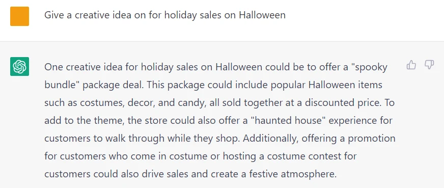 Type what do you want from this artificial intellect (AI) and wait for an answer. The answer will appear gradually on a screen, imitating a writing process. For example, you may ask Give a creative idea for holiday sales on Halloween.