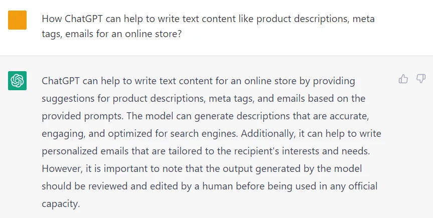 An artificial intellect can help you make any text you need for your store. For example, a ChatGPT chatbot can provide you with ideas and copywriting examples that you can use to rewrite and get unique content for your eCommerce business. Its texts look highly human-like, and you can use this chatbot as a starting point in making quality and informative copywriting for any page of the store.