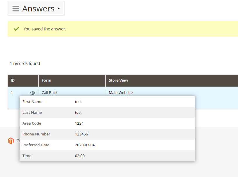 On the Answers grid page, you can sort by ID, Form, Store View, Status, Created At. At the Action column click Select for Deleting or Editing the necessary Form.