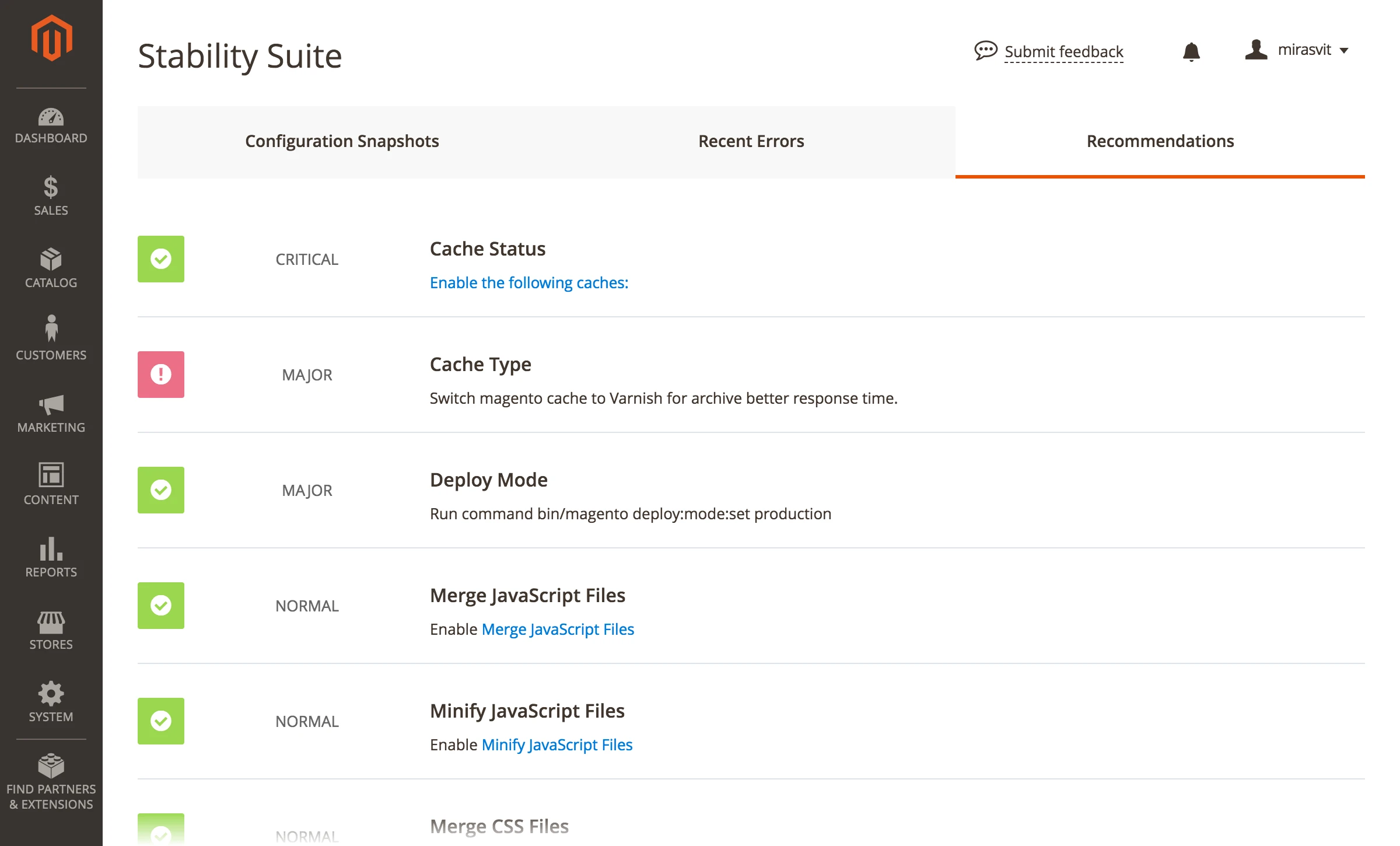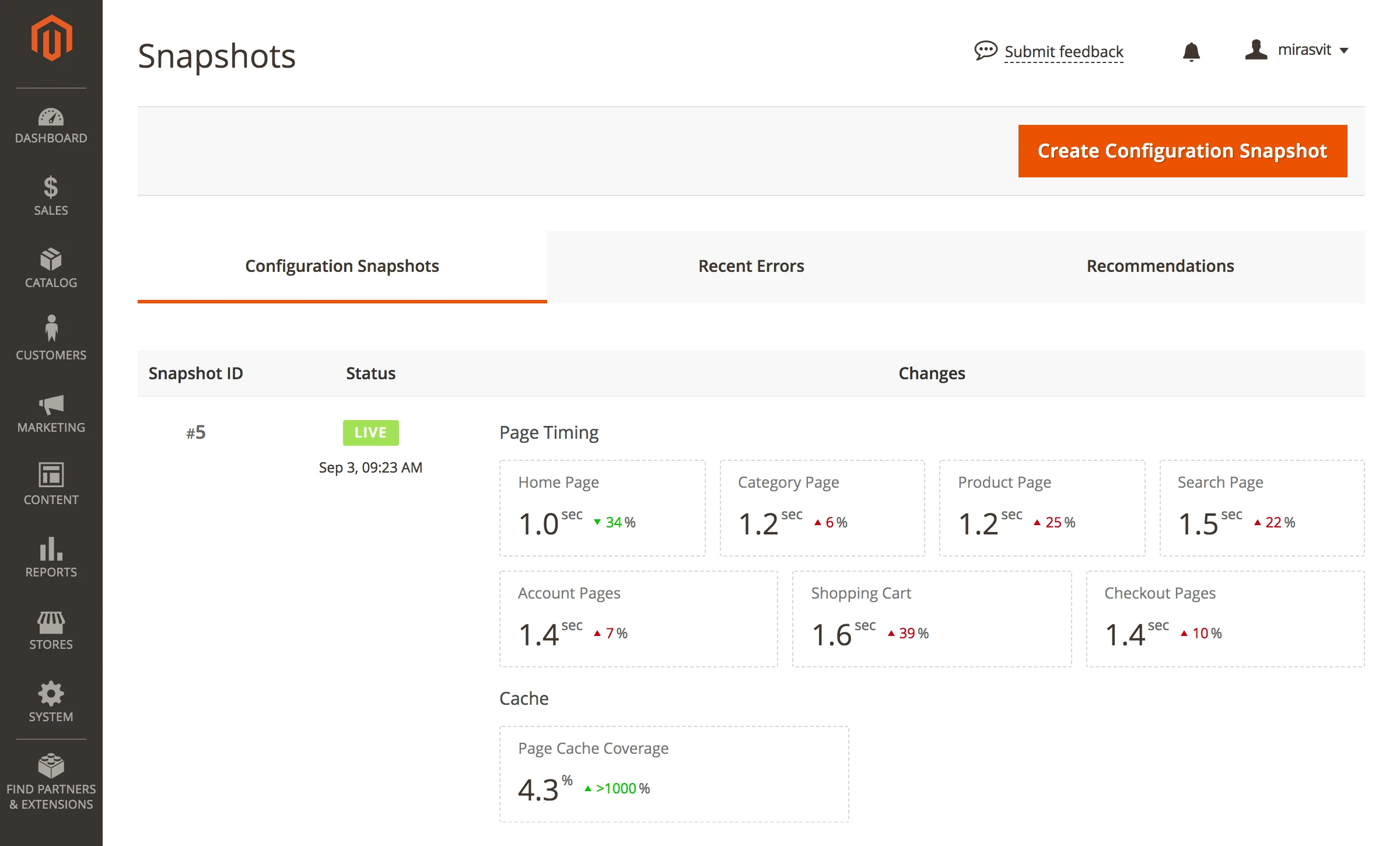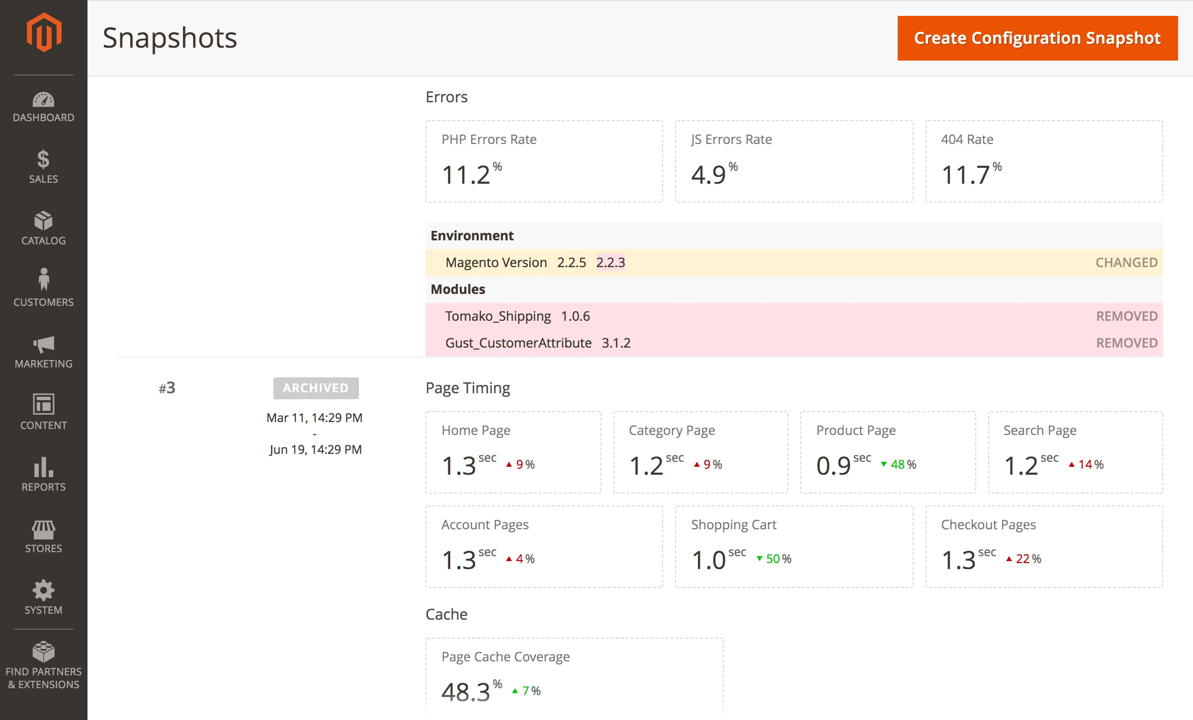 The Extension monitors code and configuration changes of your store, and automatically notifies you if these changes have negatively affected the key store indicators. If you change anything and find that either your store begins to work more slowly, or you suddenly experience new errors occurred, the extension will quickly notify you about it.
