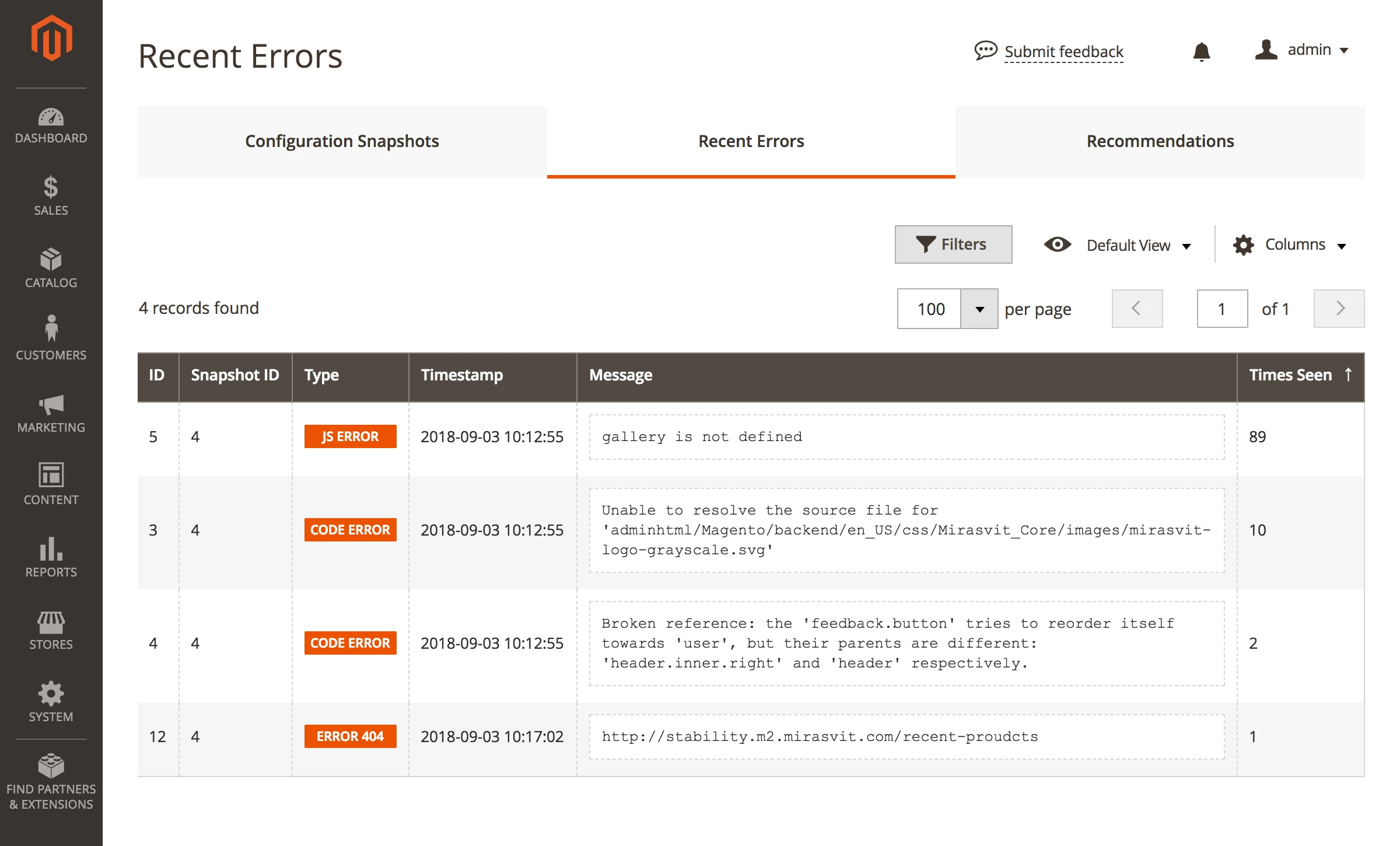 The extension monitors the following Magento 2 errors: