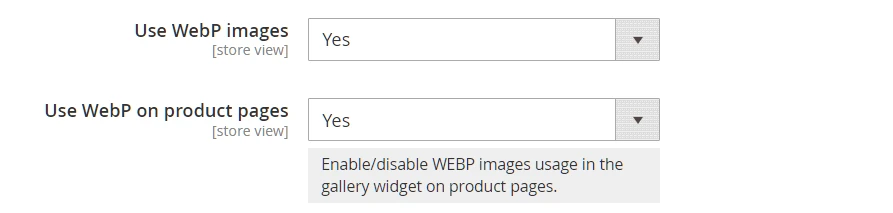 In the PageSpeed Optimize v2 the configuration option Use WebP images on product pages is removed. Images are automatically replaced with WebP on product pages if the Use WebP images setting is enabled and WebP images have been generated.