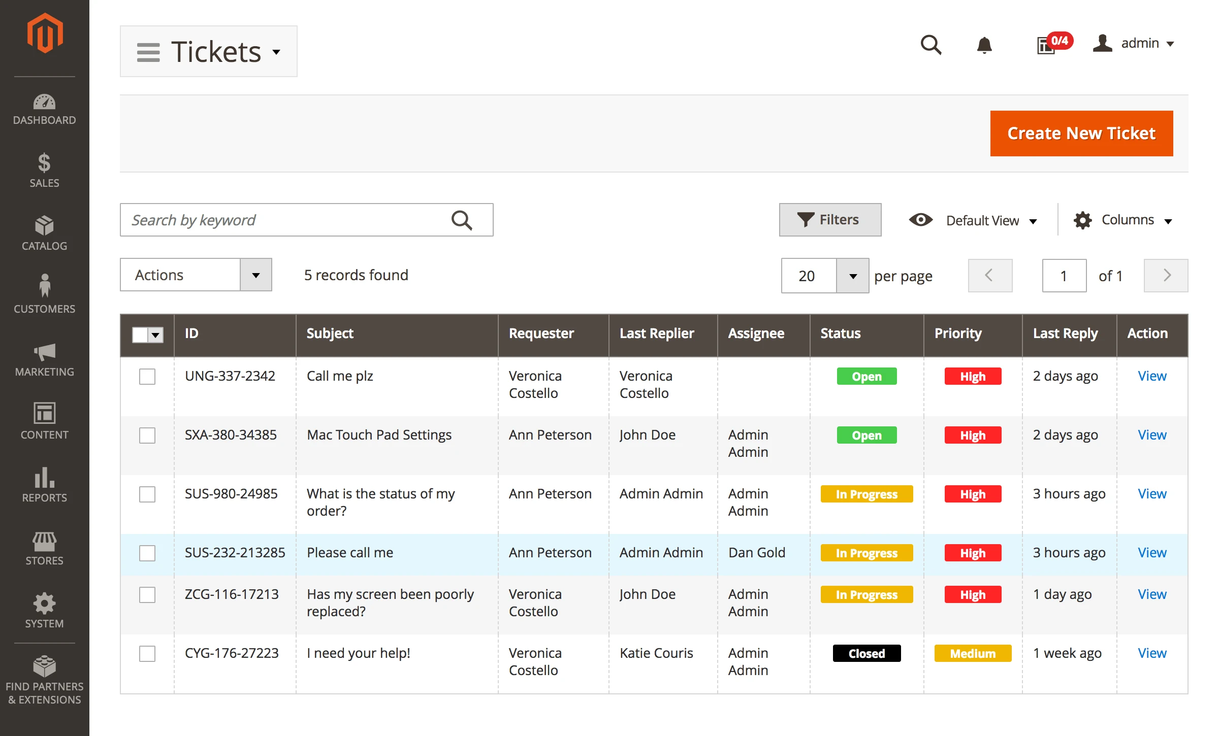 Use internal filters for fast and easy organizing of all tickets. The extension allows you to filter tickets by any field (for example, by date created, status, priority, store view, user, etc.).