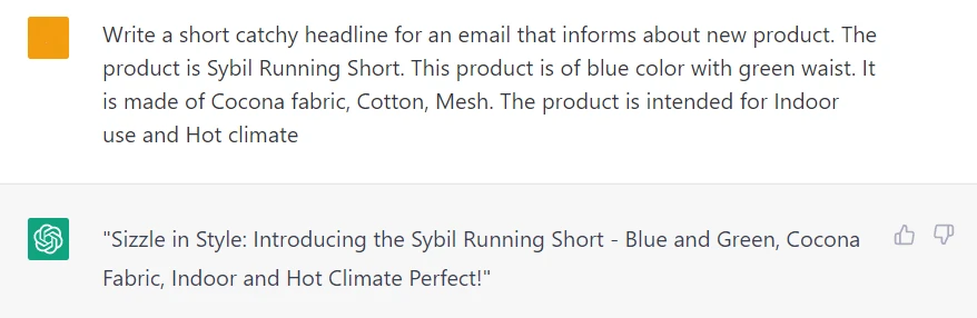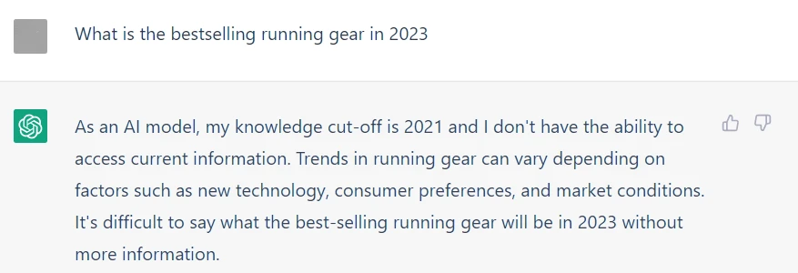 You may need to do product research first if you are writing a product description for a new item with an empty product page. ChatGPT can help you with that, but remember that its dataset is outdated. So such questions like "What is the bestselling running gear in 2023" are useless: