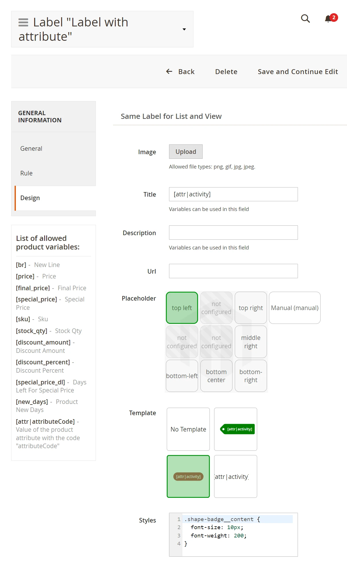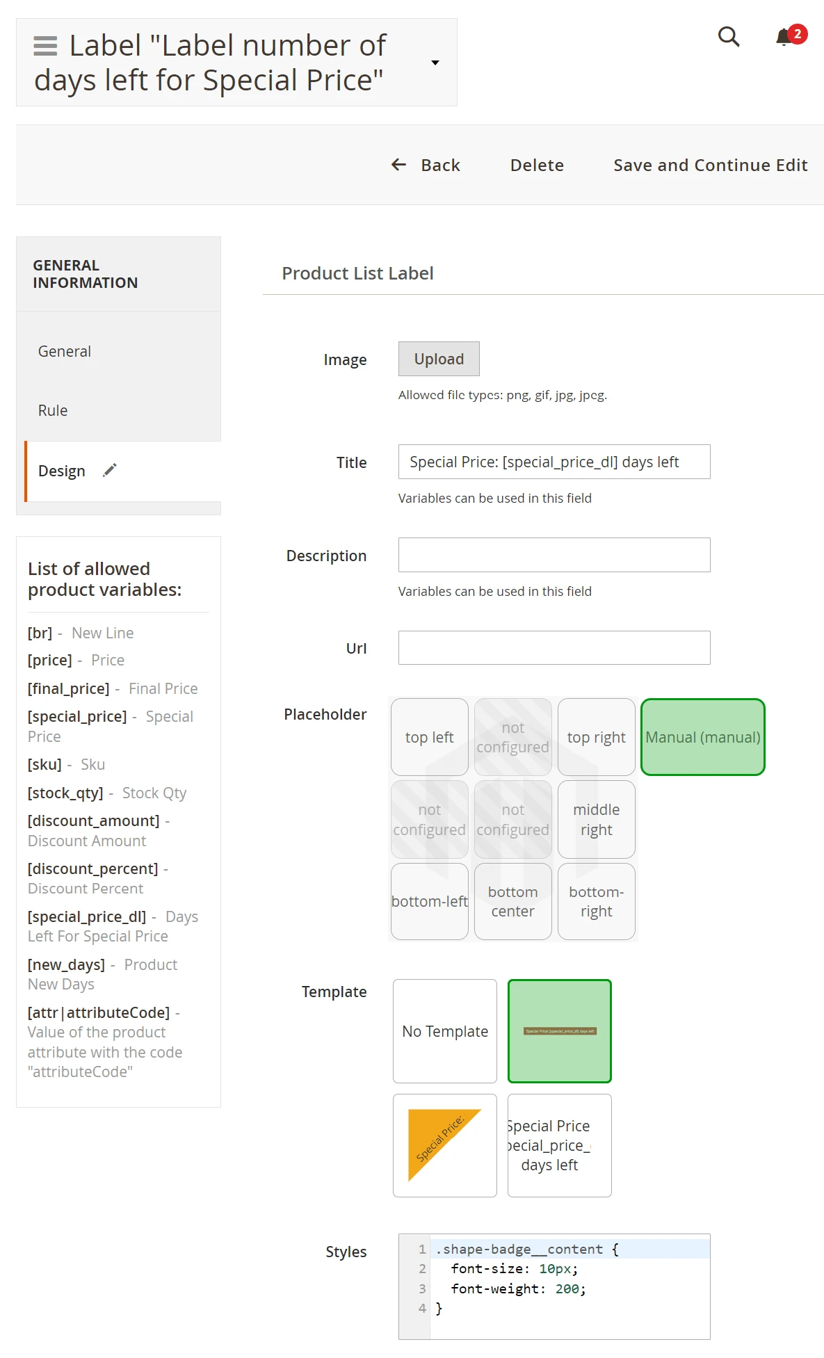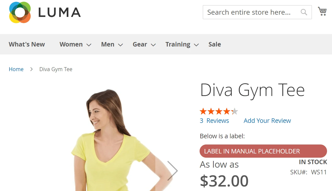 With a manual placeholder you are not restricted to placing labels on the product image. Choose this placeholder to place label anywhere on the product page or other pages of your Magento 2 store.