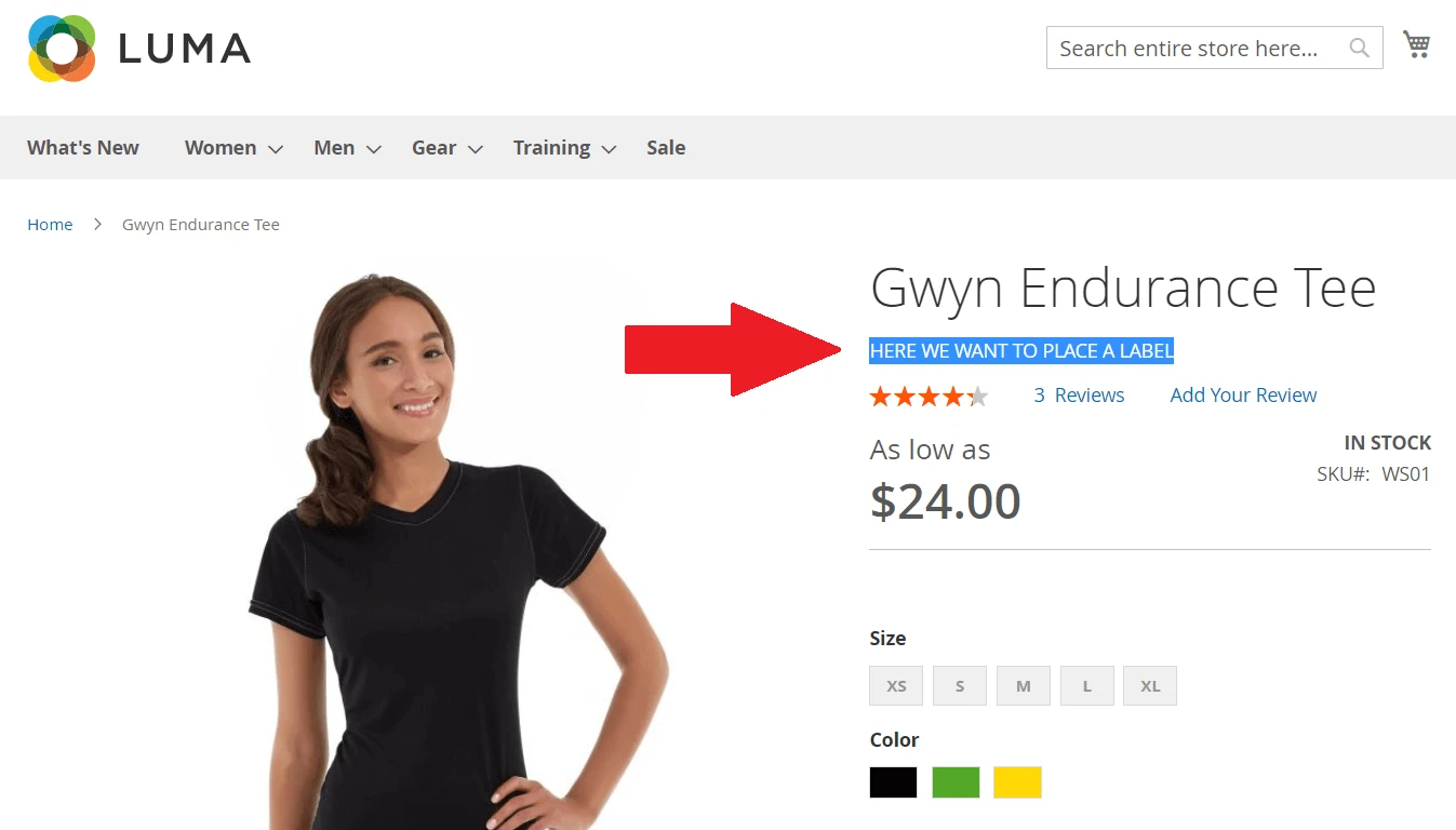 For example, you may want to place a label under the product title on the product page. Like the following: